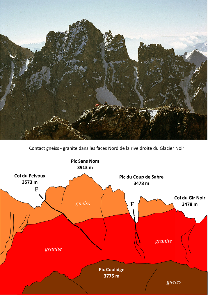 | st4 | structures | Ecrins, faces N du Pelvoux et du Coup de Sabre, faille du Coup de Sabre (décalage du contact du granite) |