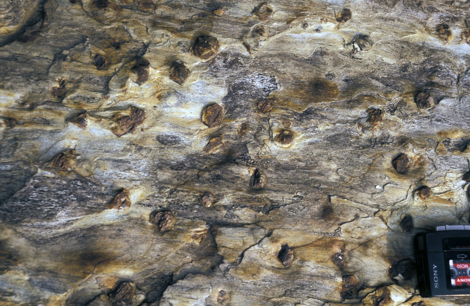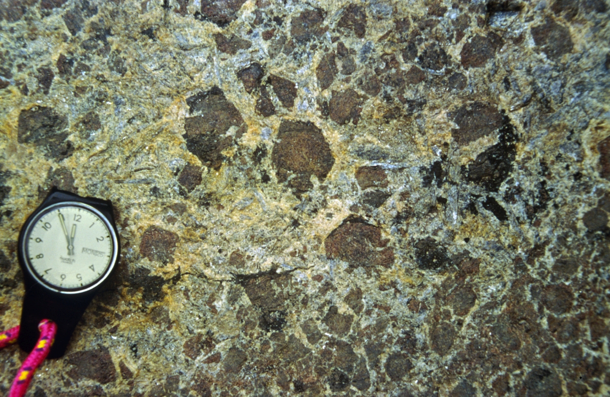 | mx1 | minéraux | Népal, Burhi Gandaki, pont sur la Machha Khola. Bloc de schiste très riche en grenats automorphes |