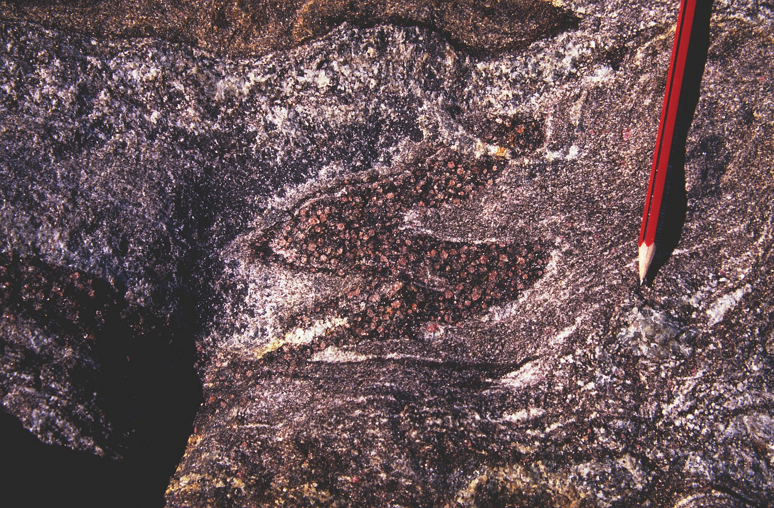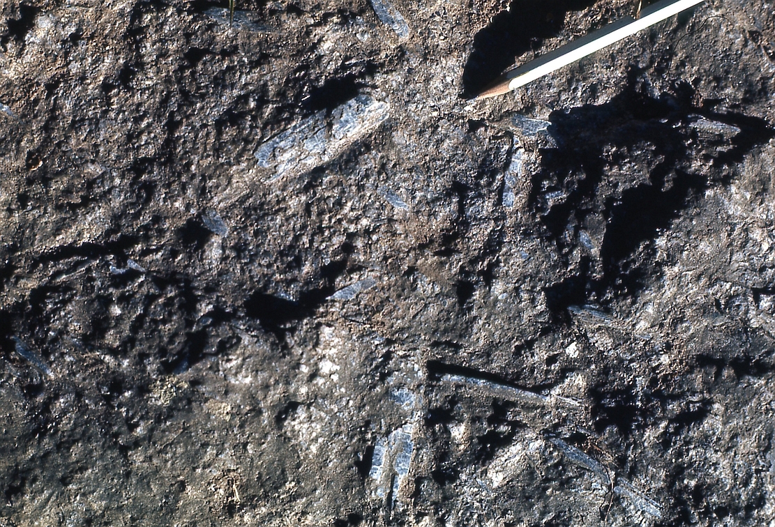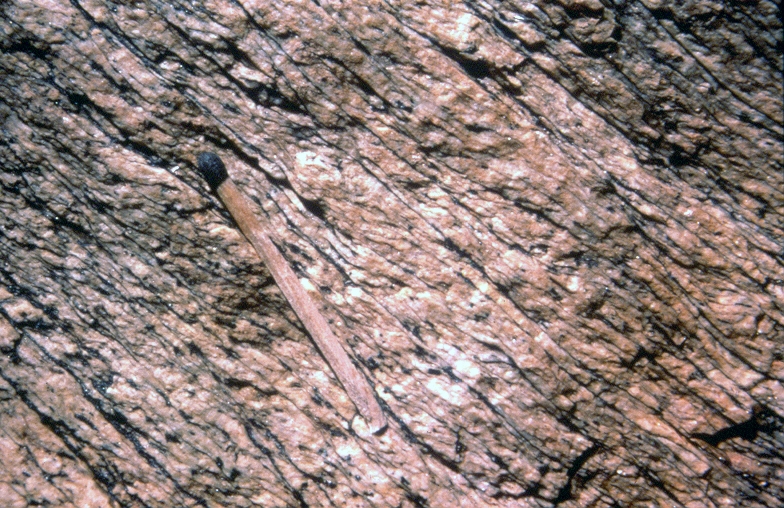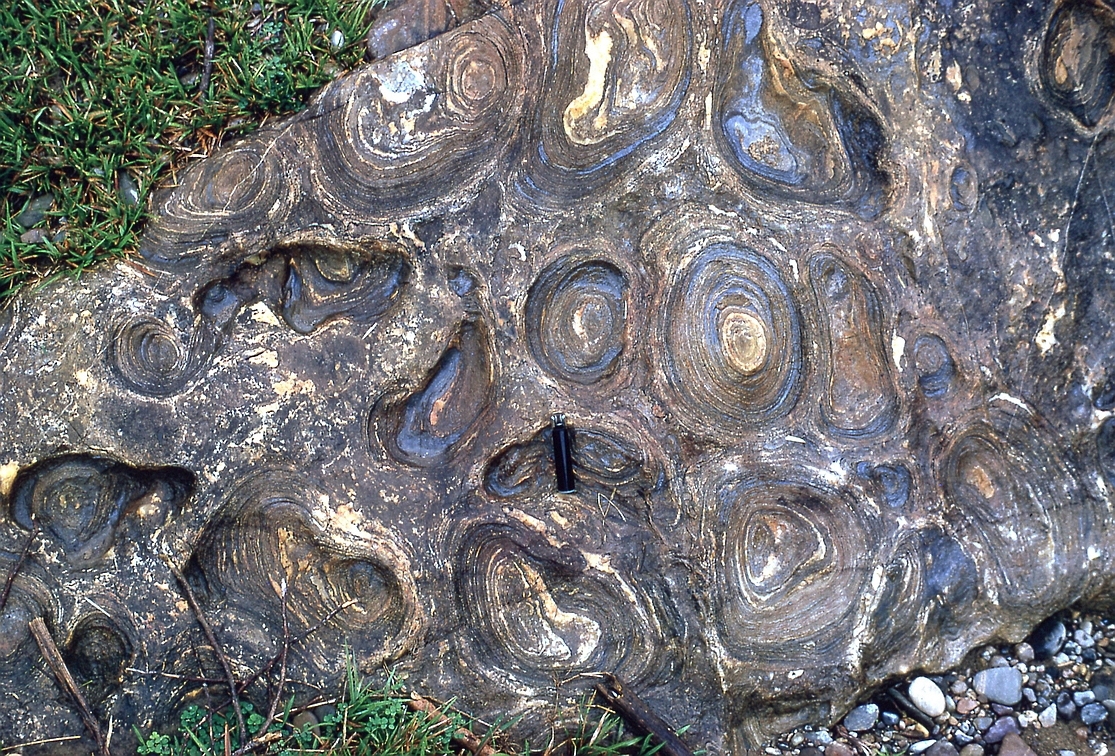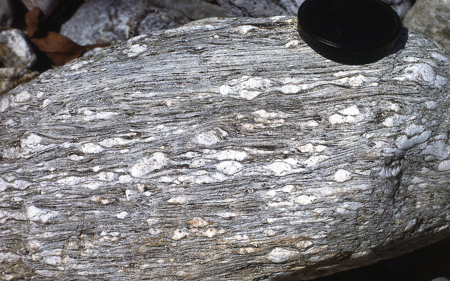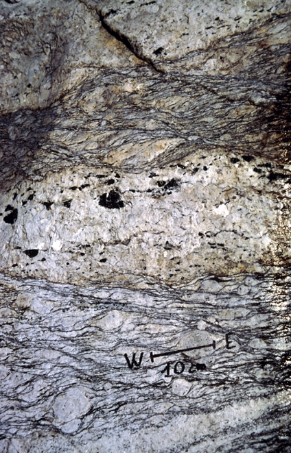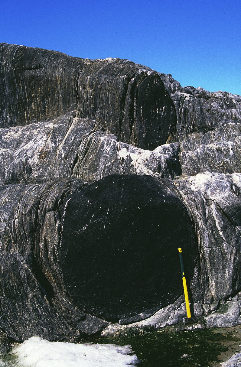 | st16 | structures | Antartique, près du Cap Gray, boudin d'amphibolite coupé perpendiculairement à l'étirement |