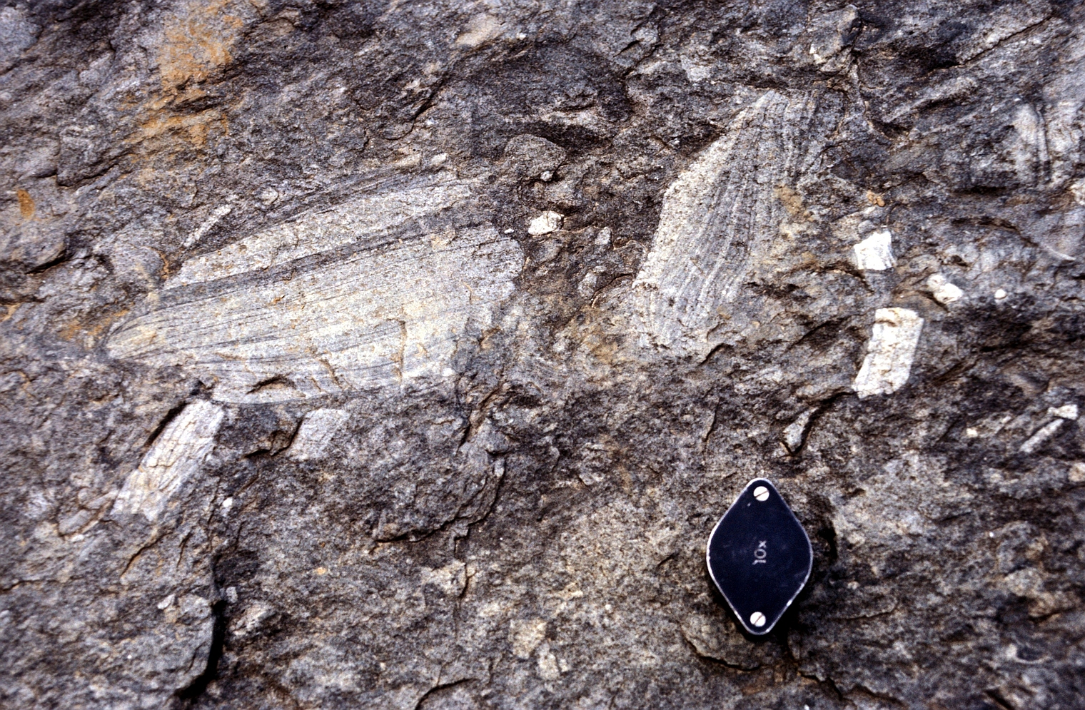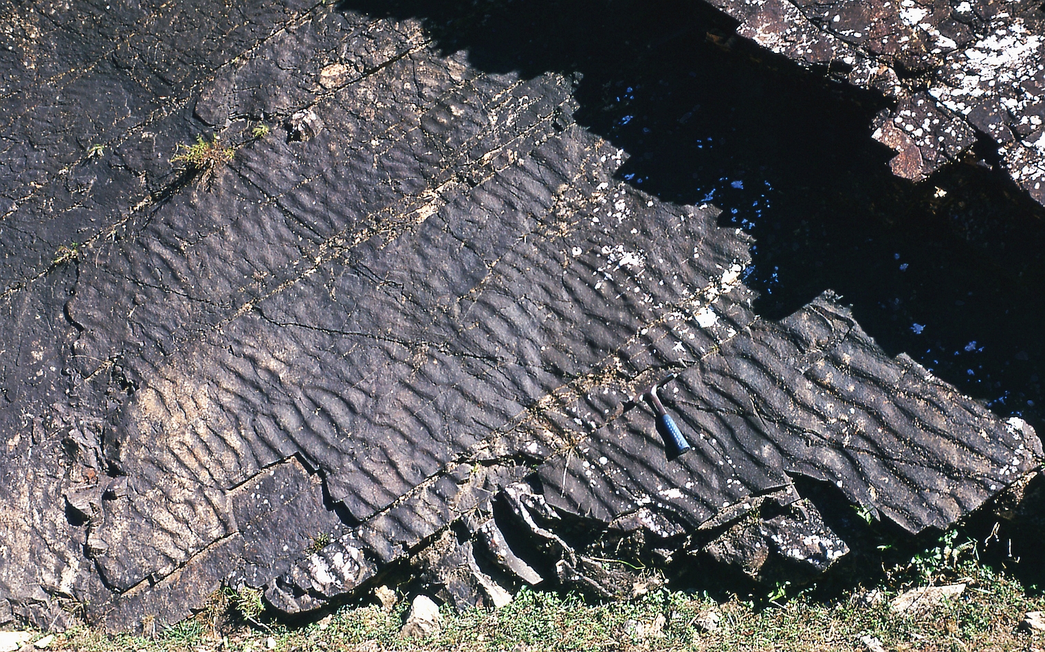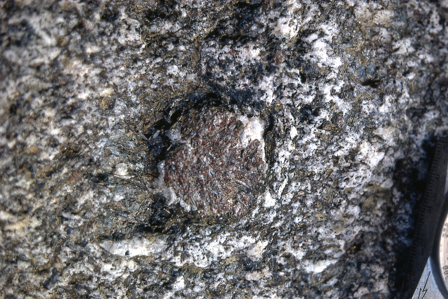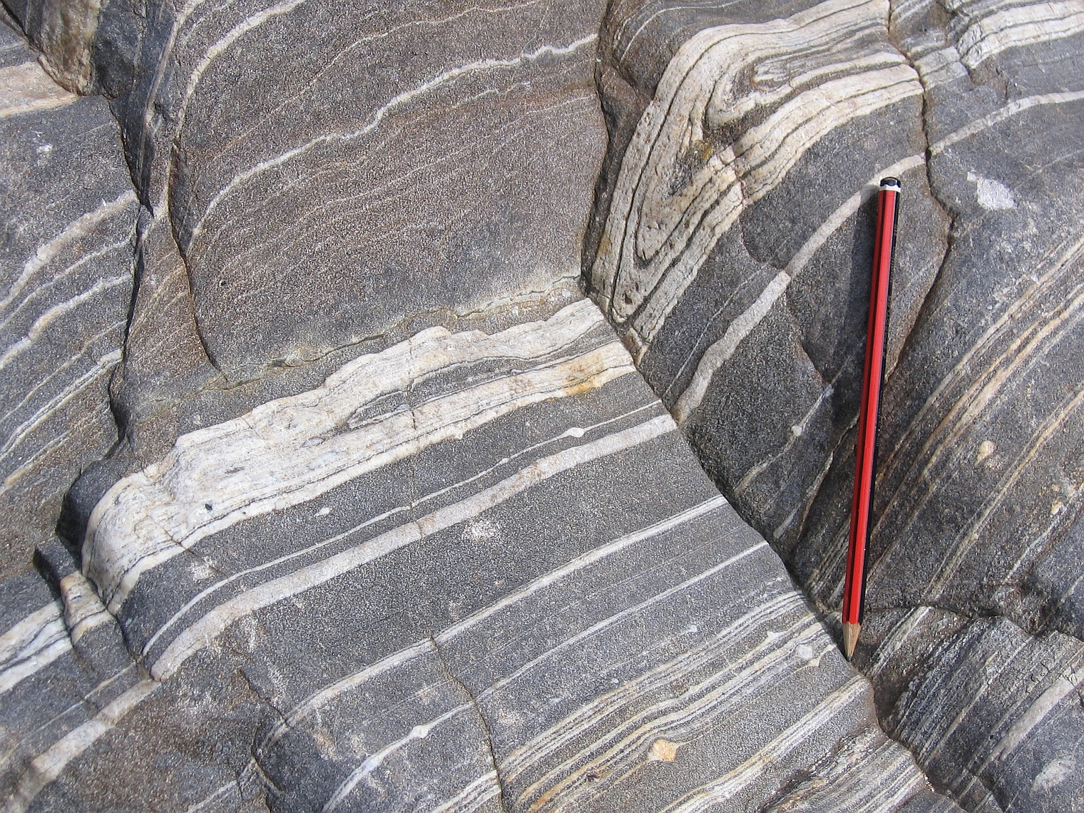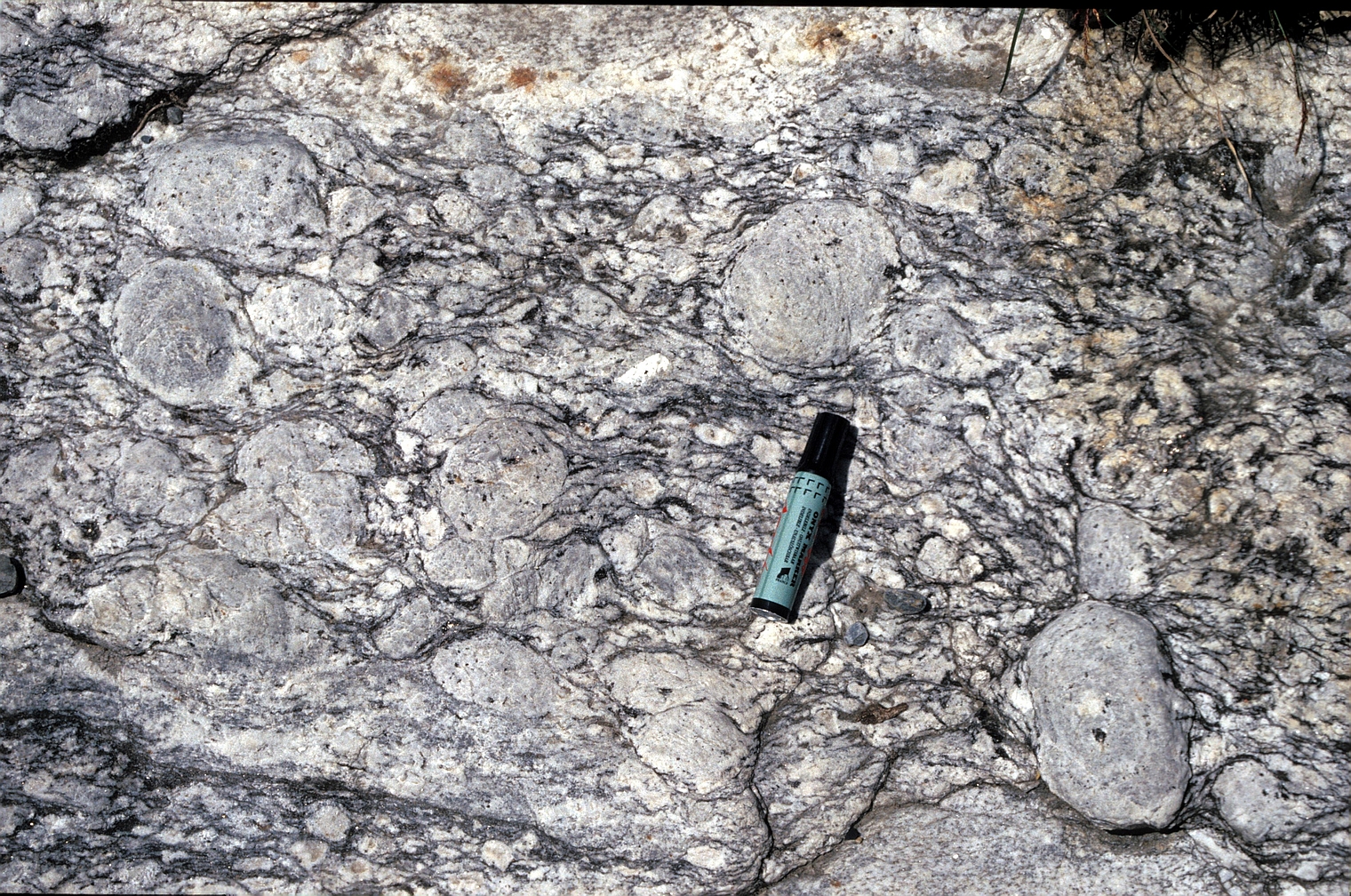 | st16 | structures | Antartique, près du Cap Gray, boudin d'amphibolite coupé perpendiculairement à l'étirement |