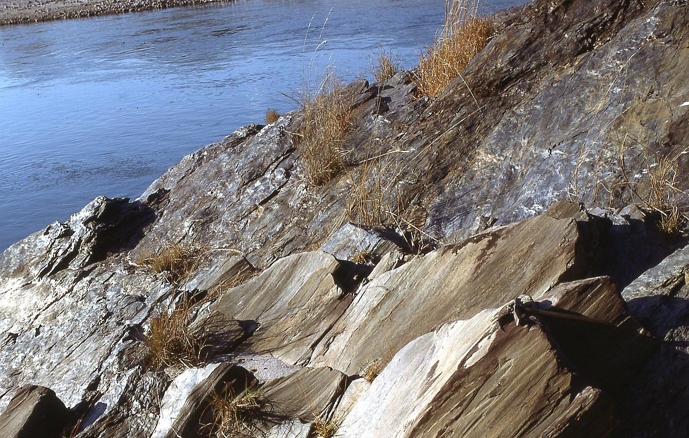 | st23 | structures | Népal, Burhi Gandaki, à mi-distance confluence Shyar et Chhuling, plan de cisaillement à sillimanite |