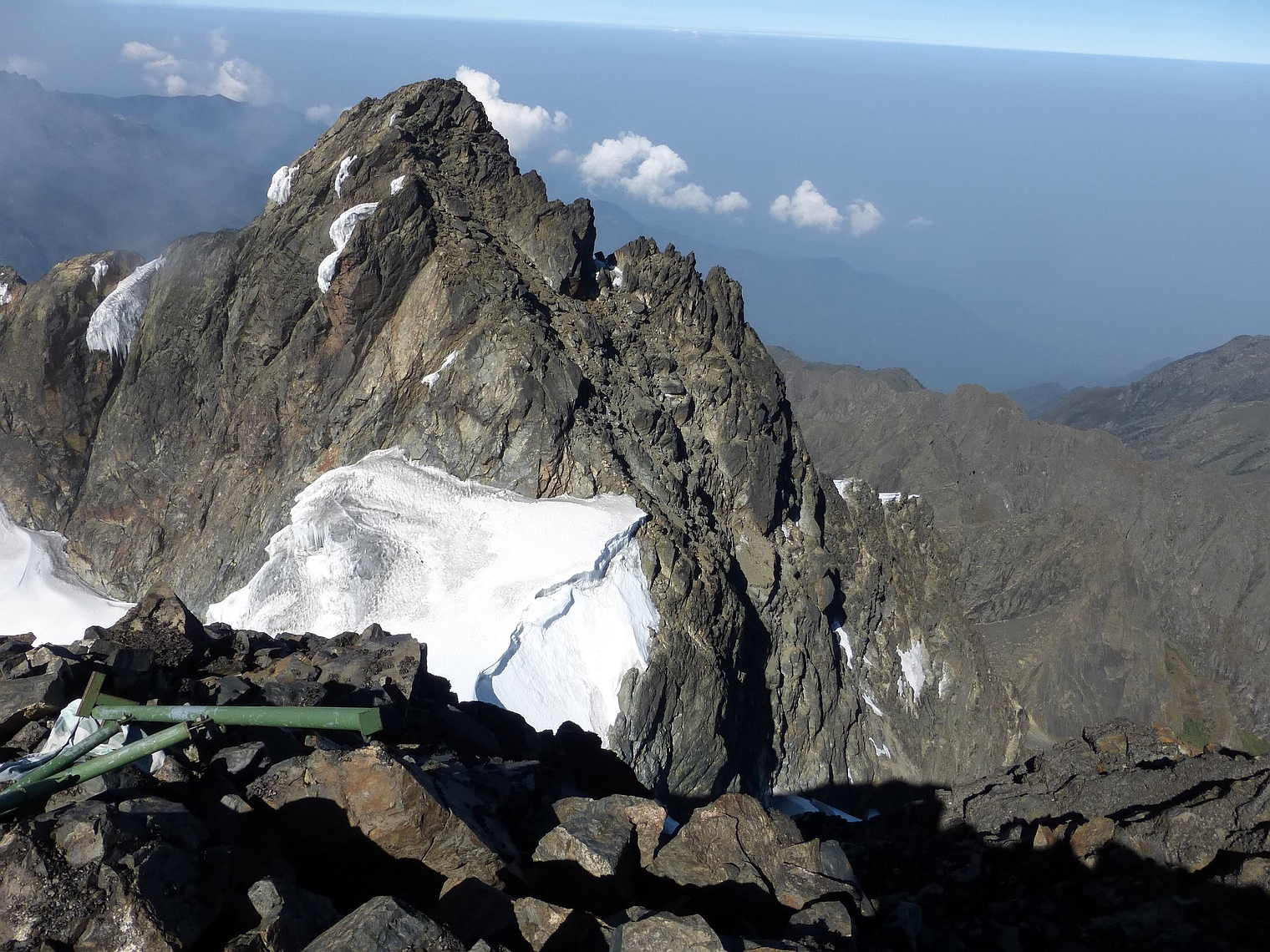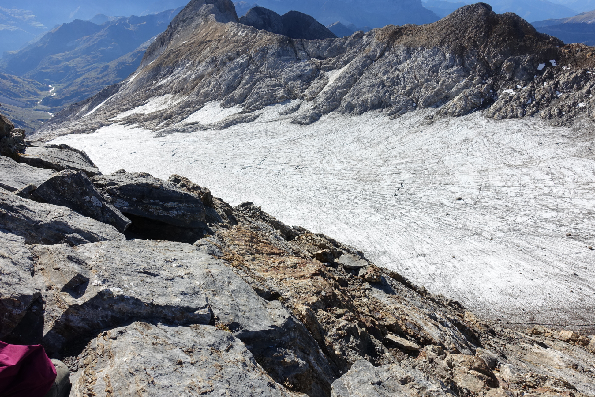 | Py25 | Pyrénées | 26/9/2019 : sommet du Vignemale (3298 m), en r.g. du glacier d'Ossoue . Au fond du glacier, à dr du col de Cerbillona, à même hauteur, 3 des 7 grottes Russel |