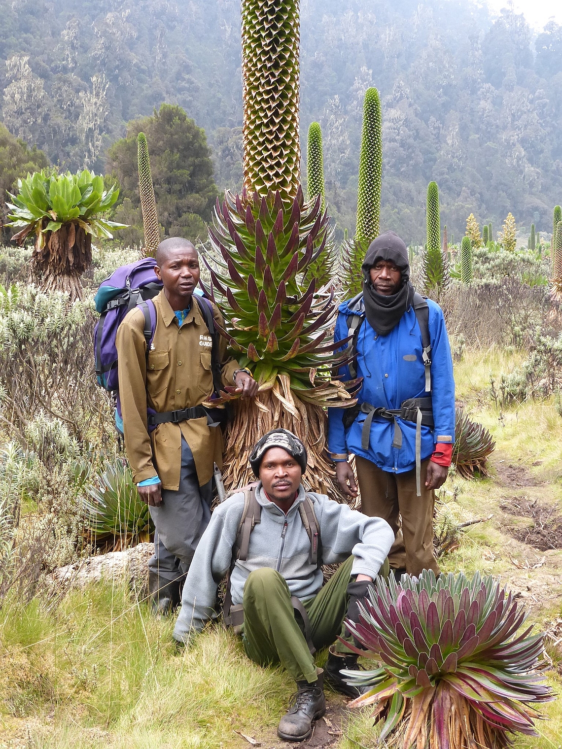 | Rw7 | Ouganda | vers le Rwenzori, porteurs au pied d'un sénéçon géant |