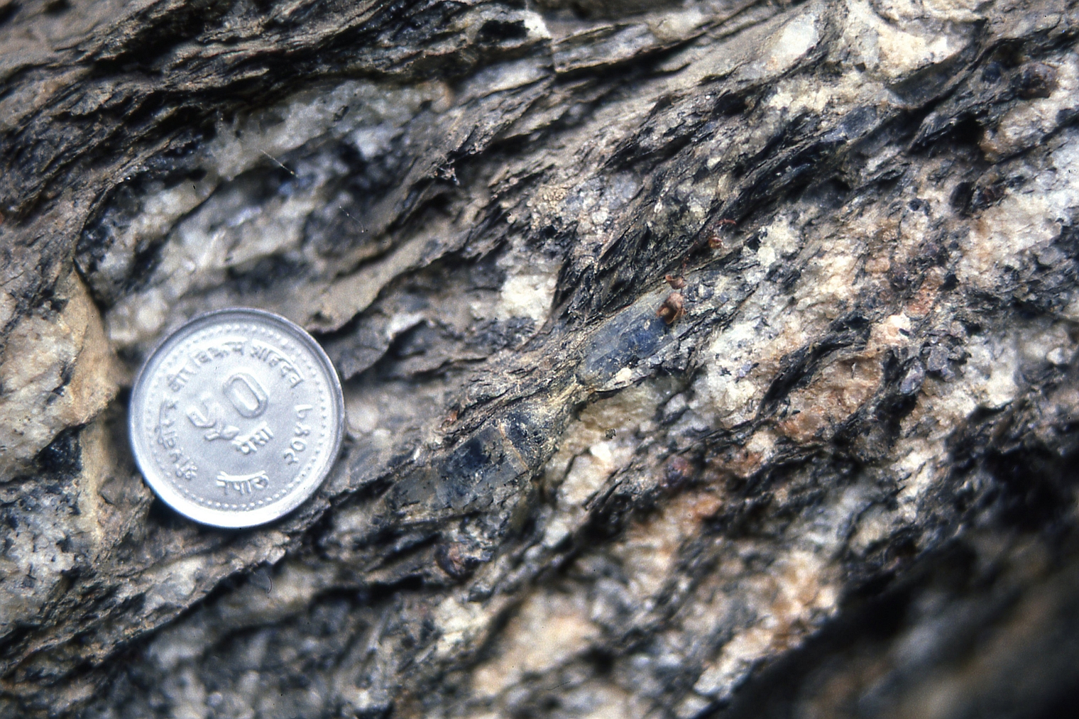 | st20 | structures | Népal, Burhi Gandaki, N du confluent de la Doban Khola, gneiss quartzeux de la base du CHH, migmatites plissées |
